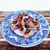 Tipp: a felezett vagy negyedelt gyümölcsöt a héjas felével tedd a tésztára. Ha aranybarnára sült, vedd ki pihenni, néhány perc után kissé össze esik, a gyümölcs levet ereszt és ha forrón felszeleteled majd úgy hagyod kihűlni, a leve lecsorog és attól ilyen szép márványos lesz.